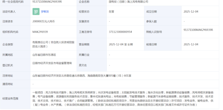 光伏头条获悉,风鸟显示,12月4日,国电投(日照)海上风电有限公司成立,法定代表人为罗朝发哪些证券公司比较好,注册资本20亿元,经营范围包括风力发电技术服务;海上风电相关系统研发;光伏发电设备租赁;太阳能发电技术服务;海水淡化处理;新能源原动设备销售;风电场相关装备销售;电气设备销售等。